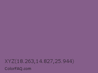 XYZ 18.263,14.827,25.944 Color is a normal magenta color and the nearest color is Chinese Violet #856088. Hex code #855e8a and RGB value is rgb(133,94,138). In RGB color space, this color is composed of 52% red, 37% green, 54% blue, In CMYK color space, this color is composed of 4% cyan, 32% magenta, 0% yellow , 46% black , In HSL color space, this color has a hue angle of 293° , 19% saturation and 45% lightness.