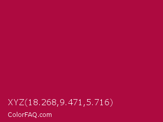 XYZ 18.268,9.471,5.716 Color is a normal rose color and the nearest color is Shiraz #b20931. Hex code #ad0a40 and RGB value is rgb(173,10,64). In RGB color space, this color is composed of 68% red, 4% green, 25% blue, In CMYK color space, this color is composed of 0% cyan, 94% magenta, 63% yellow , 32% black , In HSL color space, this color has a hue angle of 340° , 89% saturation and 36% lightness.