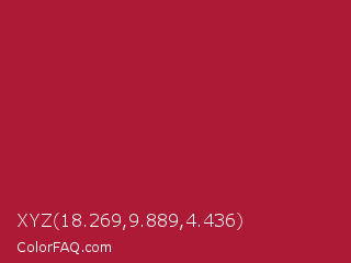 XYZ 18.269,9.889,4.436 Color is a normal red color and the nearest color is Deep Carmine #a9203e. Hex code #ad1a36 and RGB value is rgb(173,26,54). In RGB color space, this color is composed of 68% red, 10% green, 21% blue, In CMYK color space, this color is composed of 0% cyan, 85% magenta, 69% yellow , 32% black , In HSL color space, this color has a hue angle of 349° , 74% saturation and 39% lightness.