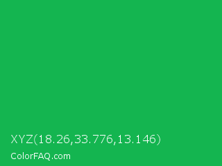 XYZ 18.26,33.776,13.146 Color is a normal green color and the nearest color is Green Pantone #00ad43. Hex code #14b550 and RGB value is rgb(20,181,80). In RGB color space, this color is composed of 8% red, 71% green, 31% blue, In CMYK color space, this color is composed of 89% cyan, 0% magenta, 56% yellow , 29% black , In HSL color space, this color has a hue angle of 142° , 80% saturation and 39% lightness.