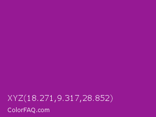 XYZ 18.271,9.317,28.852 Color is a normal magenta color and the nearest color is Violet Eggplant #991199. Hex code #961994 and RGB value is rgb(150,25,148). In RGB color space, this color is composed of 59% red, 10% green, 58% blue, In CMYK color space, this color is composed of 0% cyan, 83% magenta, 1% yellow , 41% black , In HSL color space, this color has a hue angle of 301° , 71% saturation and 34% lightness.