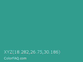 XYZ 18.282,26.75,30.186 Color is a normal cyan color and the nearest color is Zomp #39a78e. Hex code #319d8f and RGB value is rgb(49,157,143). In RGB color space, this color is composed of 19% red, 62% green, 56% blue, In CMYK color space, this color is composed of 69% cyan, 0% magenta, 9% yellow , 38% black , In HSL color space, this color has a hue angle of 172° , 52% saturation and 40% lightness.
