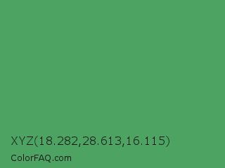 XYZ 18.282,28.613,16.115 Color is a normal green color and the nearest color is Fruit Salad #4f9d5d. Hex code #4ca362 and RGB value is rgb(76,163,98). In RGB color space, this color is composed of 30% red, 64% green, 38% blue, In CMYK color space, this color is composed of 53% cyan, 0% magenta, 40% yellow , 36% black , In HSL color space, this color has a hue angle of 135° , 36% saturation and 47% lightness.