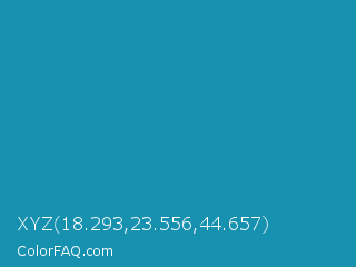 XYZ 18.293,23.556,44.657 Color is a normal cyan color and the nearest color is Eastern Blue #1e9ab0. Hex code #1691b0 and RGB value is rgb(22,145,176). In RGB color space, this color is composed of 9% red, 57% green, 69% blue, In CMYK color space, this color is composed of 88% cyan, 18% magenta, 0% yellow , 31% black , In HSL color space, this color has a hue angle of 192° , 78% saturation and 39% lightness.