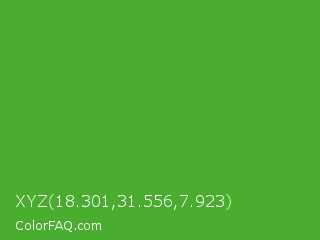 XYZ 18.301,31.556,7.923 Color is a normal green color and the nearest color is Apple #4fa83d. Hex code #4aad30 and RGB value is rgb(74,173,48). In RGB color space, this color is composed of 29% red, 68% green, 19% blue, In CMYK color space, this color is composed of 57% cyan, 0% magenta, 72% yellow , 32% black , In HSL color space, this color has a hue angle of 108° , 57% saturation and 43% lightness.