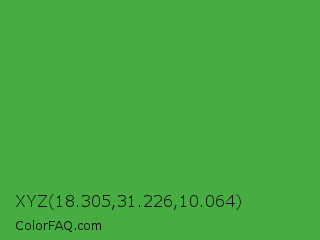 XYZ 18.305,31.226,10.064 Color is a normal green color and the nearest color is Apple #4fa83d. Hex code #47ac41 and RGB value is rgb(71,172,65). In RGB color space, this color is composed of 28% red, 67% green, 25% blue, In CMYK color space, this color is composed of 59% cyan, 0% magenta, 62% yellow , 33% black , In HSL color space, this color has a hue angle of 117° , 45% saturation and 46% lightness.