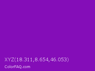 XYZ 18.311,8.654,46.053 Color is a normal purple color and the nearest color is Violet RYB #8601af. Hex code #840db8 and RGB value is rgb(132,13,184). In RGB color space, this color is composed of 52% red, 5% green, 72% blue, In CMYK color space, this color is composed of 28% cyan, 93% magenta, 0% yellow , 28% black , In HSL color space, this color has a hue angle of 282° , 87% saturation and 39% lightness.