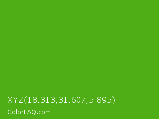 XYZ 18.313,31.607,5.895 Color is a normal green color and the nearest color is Kelly Green #4cbb17. Hex code #4fad16 and RGB value is rgb(79,173,22). In RGB color space, this color is composed of 31% red, 68% green, 9% blue, In CMYK color space, this color is composed of 54% cyan, 0% magenta, 87% yellow , 32% black , In HSL color space, this color has a hue angle of 97° , 77% saturation and 38% lightness.