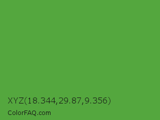XYZ 18.344,29.87,9.356 Color is a normal green color and the nearest color is Apple #4fa83d. Hex code #54a73e and RGB value is rgb(84,167,62). In RGB color space, this color is composed of 33% red, 65% green, 24% blue, In CMYK color space, this color is composed of 50% cyan, 0% magenta, 63% yellow , 35% black , In HSL color space, this color has a hue angle of 107° , 46% saturation and 45% lightness.