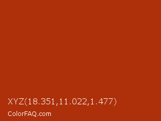 XYZ 18.351,11.022,1.477 Color is a normal red color and the nearest color is Tabasco #a02712. Hex code #ad300b and RGB value is rgb(173,48,11). In RGB color space, this color is composed of 68% red, 19% green, 4% blue, In CMYK color space, this color is composed of 0% cyan, 72% magenta, 94% yellow , 32% black , In HSL color space, this color has a hue angle of 14° , 88% saturation and 36% lightness.