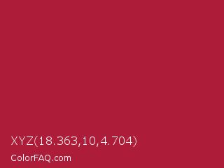XYZ 18.363,10,4.704 Color is a normal red color and the nearest color is Deep Carmine #a9203e. Hex code #ad1c38 and RGB value is rgb(173,28,56). In RGB color space, this color is composed of 68% red, 11% green, 22% blue, In CMYK color space, this color is composed of 0% cyan, 84% magenta, 68% yellow , 32% black , In HSL color space, this color has a hue angle of 348° , 72% saturation and 39% lightness.