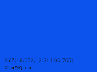 XYZ 18.372,12.314,80.765 Color is a normal blue color and the nearest color is Blue RYB #0247fe. Hex code #0b53ec and RGB value is rgb(11,83,236). In RGB color space, this color is composed of 4% red, 33% green, 93% blue, In CMYK color space, this color is composed of 95% cyan, 65% magenta, 0% yellow , 7% black , In HSL color space, this color has a hue angle of 221° , 91% saturation and 48% lightness.