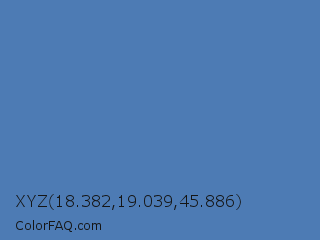 XYZ 18.382,19.039,45.886 Color is a normal blue color and the nearest color is Cyan Azure #4e82b4. Hex code #4d7bb4 and RGB value is rgb(77,123,180). In RGB color space, this color is composed of 30% red, 48% green, 71% blue, In CMYK color space, this color is composed of 57% cyan, 32% magenta, 0% yellow , 29% black , In HSL color space, this color has a hue angle of 213° , 41% saturation and 50% lightness.