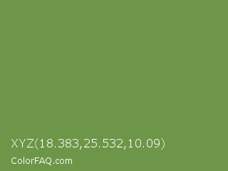 XYZ 18.383,25.532,10.09 Color is a normal green color and the nearest color is Palm Leaf #6f9940. Hex code #6d9648 and RGB value is rgb(109,150,72). In RGB color space, this color is composed of 43% red, 59% green, 28% blue, In CMYK color space, this color is composed of 27% cyan, 0% magenta, 52% yellow , 41% black , In HSL color space, this color has a hue angle of 92° , 35% saturation and 44% lightness.