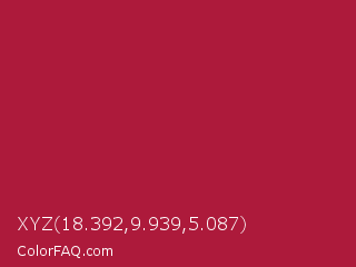 XYZ 18.392,9.939,5.087 Color is a normal red color and the nearest color is Deep Carmine #a9203e. Hex code #ad1a3b and RGB value is rgb(173,26,59). In RGB color space, this color is composed of 68% red, 10% green, 23% blue, In CMYK color space, this color is composed of 0% cyan, 85% magenta, 66% yellow , 32% black , In HSL color space, this color has a hue angle of 347° , 74% saturation and 39% lightness.