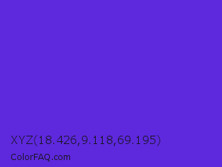 XYZ 18.426,9.118,69.195 Color is a normal indigo color and the nearest color is Purple Heart Crayola #652dc1. Hex code #5e28dd and RGB value is rgb(94,40,221). In RGB color space, this color is composed of 37% red, 16% green, 87% blue, In CMYK color space, this color is composed of 57% cyan, 82% magenta, 0% yellow , 13% black , In HSL color space, this color has a hue angle of 258° , 73% saturation and 51% lightness.