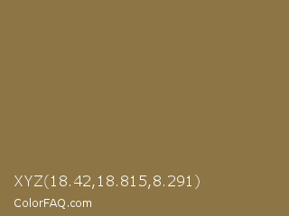 XYZ 18.42,18.815,8.291 Color is a normal orange color and the nearest color is Gold Fusion #85754e. Hex code #8d7545 and RGB value is rgb(141,117,69). In RGB color space, this color is composed of 55% red, 46% green, 27% blue, In CMYK color space, this color is composed of 0% cyan, 17% magenta, 51% yellow , 45% black , In HSL color space, this color has a hue angle of 40° , 34% saturation and 41% lightness.