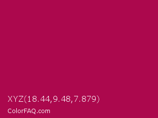 XYZ 18.44,9.48,7.879 Color is a normal rose color and the nearest color is Jazzberry Jam #a50b5e. Hex code #ac084d and RGB value is rgb(172,8,77). In RGB color space, this color is composed of 67% red, 3% green, 30% blue, In CMYK color space, this color is composed of 0% cyan, 95% magenta, 55% yellow , 33% black , In HSL color space, this color has a hue angle of 335° , 91% saturation and 35% lightness.