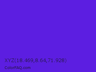 XYZ 18.469,8.64,71.928 Color is a normal indigo color and the nearest color is Han Purple #5218fa. Hex code #5c1ee1 and RGB value is rgb(92,30,225). In RGB color space, this color is composed of 36% red, 12% green, 88% blue, In CMYK color space, this color is composed of 59% cyan, 87% magenta, 0% yellow , 12% black , In HSL color space, this color has a hue angle of 259° , 76% saturation and 50% lightness.