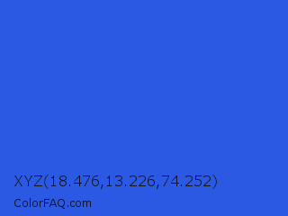 XYZ 18.476,13.226,74.252 Color is a normal blue color and the nearest color is Royal Blue #4169e1. Hex code #2c59e3 and RGB value is rgb(44,89,227). In RGB color space, this color is composed of 17% red, 35% green, 89% blue, In CMYK color space, this color is composed of 81% cyan, 61% magenta, 0% yellow , 11% black , In HSL color space, this color has a hue angle of 225° , 77% saturation and 53% lightness.
