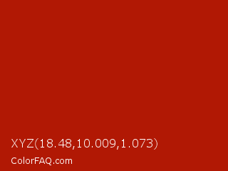 XYZ 18.48,10.009,1.073 Color is a normal red color and the nearest color is Milano Red #b81104. Hex code #b11804 and RGB value is rgb(177,24,4). In RGB color space, this color is composed of 69% red, 9% green, 2% blue, In CMYK color space, this color is composed of 0% cyan, 86% magenta, 98% yellow , 31% black , In HSL color space, this color has a hue angle of 7° , 96% saturation and 35% lightness.