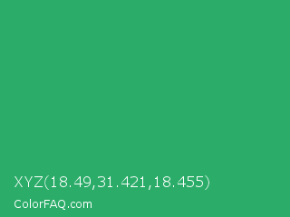 XYZ 18.49,31.421,18.455 Color is a normal green color and the nearest color is Medium Sea Green #3cb371. Hex code #2bad69 and RGB value is rgb(43,173,105). In RGB color space, this color is composed of 17% red, 68% green, 41% blue, In CMYK color space, this color is composed of 75% cyan, 0% magenta, 39% yellow , 32% black , In HSL color space, this color has a hue angle of 149° , 60% saturation and 42% lightness.