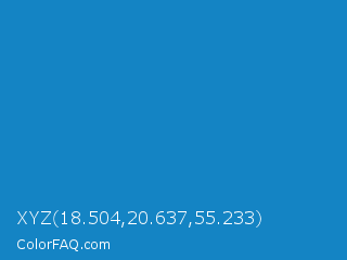 XYZ 18.504,20.637,55.233 Color is a normal blue color and the nearest color is Cyan Cornflower Blue #188bc2. Hex code #1484c4 and RGB value is rgb(20,132,196). In RGB color space, this color is composed of 8% red, 52% green, 77% blue, In CMYK color space, this color is composed of 90% cyan, 33% magenta, 0% yellow , 23% black , In HSL color space, this color has a hue angle of 202° , 81% saturation and 42% lightness.