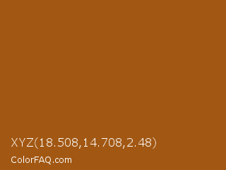 XYZ 18.508,14.708,2.48 Color is a normal orange color and the nearest color is Hawaiian Tan #9d5616. Hex code #a25813 and RGB value is rgb(162,88,19). In RGB color space, this color is composed of 64% red, 35% green, 7% blue, In CMYK color space, this color is composed of 0% cyan, 46% magenta, 88% yellow , 36% black , In HSL color space, this color has a hue angle of 29° , 79% saturation and 35% lightness.