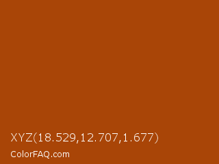 XYZ 18.529,12.707,1.677 Color is a normal orange color and the nearest color is Fire #aa4203. Hex code #a94507 and RGB value is rgb(169,69,7). In RGB color space, this color is composed of 66% red, 27% green, 3% blue, In CMYK color space, this color is composed of 0% cyan, 59% magenta, 96% yellow , 34% black , In HSL color space, this color has a hue angle of 23° , 92% saturation and 35% lightness.