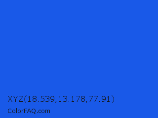XYZ 18.539,13.178,77.91 Color is a normal blue color and the nearest color is Palatinate Blue #273be2. Hex code #1959e8 and RGB value is rgb(25,89,232). In RGB color space, this color is composed of 10% red, 35% green, 91% blue, In CMYK color space, this color is composed of 89% cyan, 62% magenta, 0% yellow , 9% black , In HSL color space, this color has a hue angle of 221° , 82% saturation and 50% lightness.