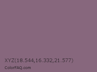 XYZ 18.544,16.332,21.577 Color is a normal magenta color and the nearest color is Chinese Violet #856088. Hex code #87677d and RGB value is rgb(135,103,125). In RGB color space, this color is composed of 53% red, 40% green, 49% blue, In CMYK color space, this color is composed of 0% cyan, 24% magenta, 7% yellow , 47% black , In HSL color space, this color has a hue angle of 319° , 13% saturation and 47% lightness.