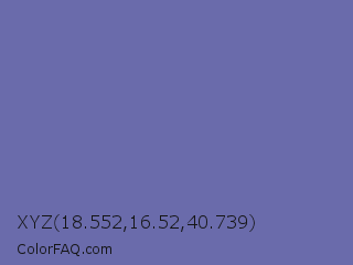 XYZ 18.552,16.52,40.739 Color is a normal blue color and the nearest color is Scampi #675fa6. Hex code #6a6bab and RGB value is rgb(106,107,171). In RGB color space, this color is composed of 42% red, 42% green, 67% blue, In CMYK color space, this color is composed of 38% cyan, 37% magenta, 0% yellow , 33% black , In HSL color space, this color has a hue angle of 239° , 28% saturation and 54% lightness.