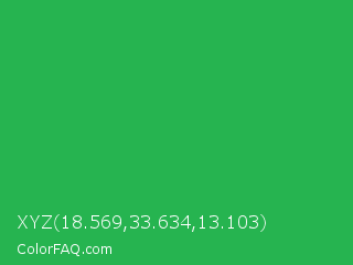 XYZ 18.569,33.634,13.103 Color is a normal green color and the nearest color is Wageningen Green #34b233. Hex code #26b450 and RGB value is rgb(38,180,80). In RGB color space, this color is composed of 15% red, 71% green, 31% blue, In CMYK color space, this color is composed of 79% cyan, 0% magenta, 56% yellow , 29% black , In HSL color space, this color has a hue angle of 138° , 65% saturation and 43% lightness.