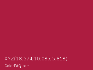 XYZ 18.574,10.085,5.818 Color is a normal red color and the nearest color is French Wine #ac1e44. Hex code #ad1c40 and RGB value is rgb(173,28,64). In RGB color space, this color is composed of 68% red, 11% green, 25% blue, In CMYK color space, this color is composed of 0% cyan, 84% magenta, 63% yellow , 32% black , In HSL color space, this color has a hue angle of 345° , 72% saturation and 39% lightness.
