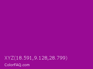 XYZ 18.591,9.128,28.799 Color is a normal magenta color and the nearest color is Violet Eggplant #991199. Hex code #990a94 and RGB value is rgb(153,10,148). In RGB color space, this color is composed of 60% red, 4% green, 58% blue, In CMYK color space, this color is composed of 0% cyan, 93% magenta, 3% yellow , 40% black , In HSL color space, this color has a hue angle of 302° , 88% saturation and 32% lightness.