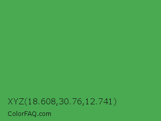 XYZ 18.608,30.76,12.741 Color is a normal green color and the nearest color is Chateau Green #40a860. Hex code #49aa51 and RGB value is rgb(73,170,81). In RGB color space, this color is composed of 29% red, 67% green, 32% blue, In CMYK color space, this color is composed of 57% cyan, 0% magenta, 52% yellow , 33% black , In HSL color space, this color has a hue angle of 125° , 40% saturation and 48% lightness.
