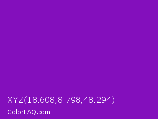 XYZ 18.608,8.798,48.294 Color is a normal purple color and the nearest color is Violet RYB #8601af. Hex code #830fbc and RGB value is rgb(131,15,188). In RGB color space, this color is composed of 51% red, 6% green, 74% blue, In CMYK color space, this color is composed of 30% cyan, 92% magenta, 0% yellow , 26% black , In HSL color space, this color has a hue angle of 280° , 85% saturation and 40% lightness.