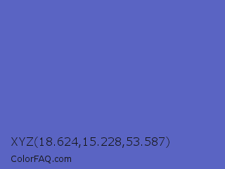 XYZ 18.624,15.228,53.587 Color is a normal blue color and the nearest color is Indigo #4f69c6. Hex code #5a64c3 and RGB value is rgb(90,100,195). In RGB color space, this color is composed of 35% red, 39% green, 76% blue, In CMYK color space, this color is composed of 54% cyan, 49% magenta, 0% yellow , 24% black , In HSL color space, this color has a hue angle of 234° , 47% saturation and 56% lightness.
