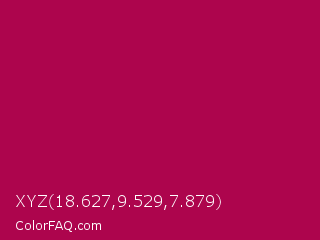 XYZ 18.627,9.529,7.879 Color is a normal rose color and the nearest color is Jazzberry Jam #a50b5e. Hex code #ad054d and RGB value is rgb(173,5,77). In RGB color space, this color is composed of 68% red, 2% green, 30% blue, In CMYK color space, this color is composed of 0% cyan, 97% magenta, 55% yellow , 32% black , In HSL color space, this color has a hue angle of 334° , 94% saturation and 35% lightness.