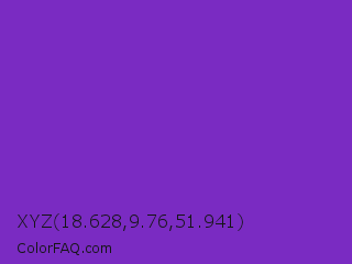 XYZ 18.628,9.76,51.941 Color is a normal purple color and the nearest color is Purple Heart Crayola #652dc1. Hex code #7a2bc2 and RGB value is rgb(122,43,194). In RGB color space, this color is composed of 48% red, 17% green, 76% blue, In CMYK color space, this color is composed of 37% cyan, 78% magenta, 0% yellow , 24% black , In HSL color space, this color has a hue angle of 271° , 64% saturation and 46% lightness.