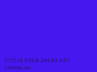 XYZ 18.633,8.244,83.047 Color is a normal indigo color and the nearest color is Han Purple #5218fa. Hex code #4717f0 and RGB value is rgb(71,23,240). In RGB color space, this color is composed of 28% red, 9% green, 94% blue, In CMYK color space, this color is composed of 70% cyan, 90% magenta, 0% yellow , 6% black , In HSL color space, this color has a hue angle of 253° , 88% saturation and 52% lightness.