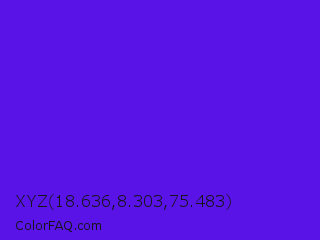 XYZ 18.636,8.303,75.483 Color is a normal indigo color and the nearest color is Han Purple #5218fa. Hex code #5913e6 and RGB value is rgb(89,19,230). In RGB color space, this color is composed of 35% red, 7% green, 90% blue, In CMYK color space, this color is composed of 61% cyan, 92% magenta, 0% yellow , 10% black , In HSL color space, this color has a hue angle of 260° , 85% saturation and 49% lightness.