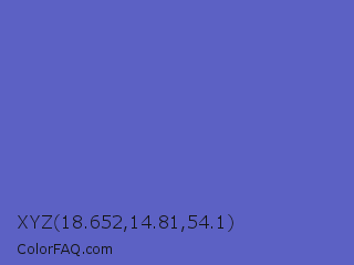 XYZ 18.652,14.81,54.1 Color is a normal blue color and the nearest color is Indigo #4f69c6. Hex code #5c61c4 and RGB value is rgb(92,97,196). In RGB color space, this color is composed of 36% red, 38% green, 77% blue, In CMYK color space, this color is composed of 53% cyan, 51% magenta, 0% yellow , 23% black , In HSL color space, this color has a hue angle of 237° , 47% saturation and 56% lightness.