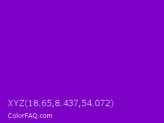 XYZ 18.65,8.437,54.072 Color is a normal purple color and the nearest color is French Violet #8806ce. Hex code #7d00c6 and RGB value is rgb(125,0,198). In RGB color space, this color is composed of 49% red, 0% green, 78% blue, In CMYK color space, this color is composed of 37% cyan, 100% magenta, 0% yellow , 22% black , In HSL color space, this color has a hue angle of 278° , 100% saturation and 39% lightness.