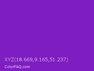XYZ 18.669,9.165,51.237 Color is a normal purple color and the nearest color is French Violet #8806ce. Hex code #7e1dc1 and RGB value is rgb(126,29,193). In RGB color space, this color is composed of 49% red, 11% green, 76% blue, In CMYK color space, this color is composed of 35% cyan, 85% magenta, 0% yellow , 24% black , In HSL color space, this color has a hue angle of 275° , 74% saturation and 44% lightness.
