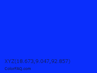 XYZ 18.673,9.047,92.857 Color is a normal blue color and the nearest color is Blue RYB #0247fe. Hex code #0a2efc and RGB value is rgb(10,46,252). In RGB color space, this color is composed of 4% red, 18% green, 99% blue, In CMYK color space, this color is composed of 96% cyan, 82% magenta, 0% yellow , 1% black , In HSL color space, this color has a hue angle of 231° , 98% saturation and 51% lightness.