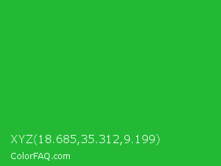 XYZ 18.685,35.312,9.199 Color is a normal green color and the nearest color is Wageningen Green #34b233. Hex code #23b935 and RGB value is rgb(35,185,53). In RGB color space, this color is composed of 14% red, 73% green, 21% blue, In CMYK color space, this color is composed of 81% cyan, 0% magenta, 71% yellow , 27% black , In HSL color space, this color has a hue angle of 127° , 68% saturation and 43% lightness.