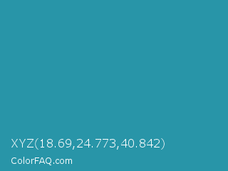 XYZ 18.69,24.773,40.842 Color is a normal cyan color and the nearest color is Eastern Blue #1e9ab0. Hex code #2895a8 and RGB value is rgb(40,149,168). In RGB color space, this color is composed of 16% red, 58% green, 66% blue, In CMYK color space, this color is composed of 76% cyan, 11% magenta, 0% yellow , 34% black , In HSL color space, this color has a hue angle of 189° , 62% saturation and 41% lightness.