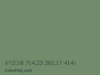 XYZ 18.714,23.262,17.414 Color is a normal green color and the nearest color is Highland #6f8e63. Hex code #708c6b and RGB value is rgb(112,140,107). In RGB color space, this color is composed of 44% red, 55% green, 42% blue, In CMYK color space, this color is composed of 20% cyan, 0% magenta, 24% yellow , 45% black , In HSL color space, this color has a hue angle of 111° , 13% saturation and 48% lightness.