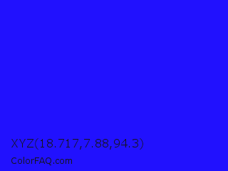 XYZ 18.717,7.88,94.3 Color is a normal indigo color and the nearest color is Bluebonnet #1c1cf0. Hex code #2111fe and RGB value is rgb(33,17,254). In RGB color space, this color is composed of 13% red, 7% green, 100% blue, In CMYK color space, this color is composed of 87% cyan, 93% magenta, 0% yellow , 0% black , In HSL color space, this color has a hue angle of 244° , 99% saturation and 53% lightness.